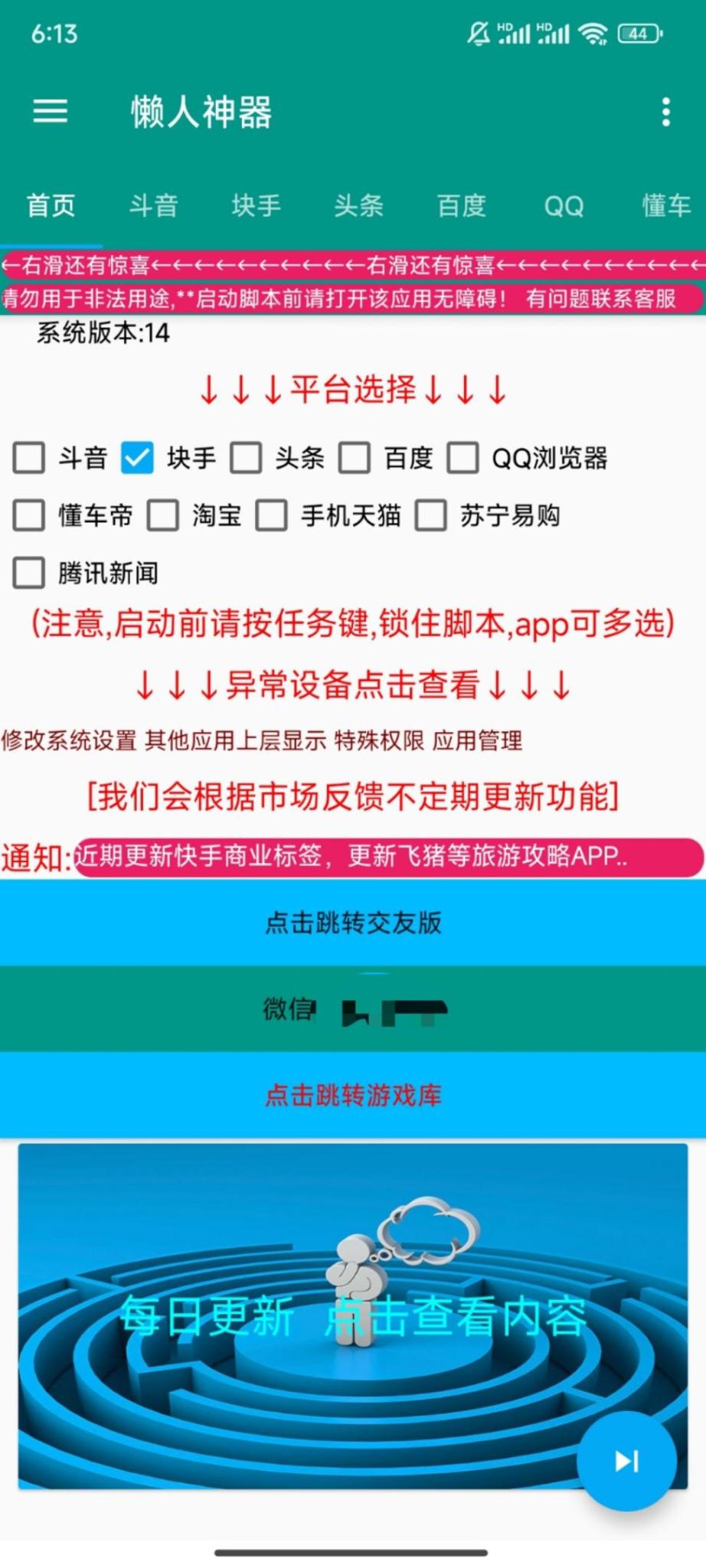 项目介绍 包含了抖音、快手、头条、百度、QQ、懂车等多个平台养号养标签脚本,具体看图 设备需求 安卓手机7.1以上系统购买后包含月卡脚本+使用教程